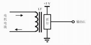 圖2為電流檢測電路示意圖。電機(jī)電流流經(jīng)一環(huán)形磁芯的電感線圈LT,在環(huán)形閉合磁路中插入線性霍爾芯片HR?;魻枡z測用的電感為環(huán)形閉合磁路,信號強(qiáng)度大,抗干擾能力強(qiáng)?;魻栞敵鲂盘枮?.5~5V,遠(yuǎn)大于應(yīng)變力敏傳感器的毫伏級輸出。交流電流產(chǎn)生的交變磁場,使霍爾芯片的輸出信號Ui最大變化為0~5V。