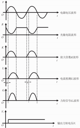 在圖1所示的相敏模擬乘法運算放大器中,同相端輸入的是電壓信號U4,電壓信號為轉(zhuǎn)換成電阻的Rv,用以確定放大倍數(shù)K。放大器的輸出信號Gi=U4K,也就是Gi=電流×電壓。從圖x可以看出,放大倍數(shù)K與電壓的正半周同頻率、同相位。電機(jī)是感性負(fù)載,所以電流滯后于電壓相位差φ。φ的大小與電機(jī)特性和負(fù)載大小有關(guān),負(fù)載越小φ越大,反之負(fù)載越大φ越小。所以,電機(jī)的力矩計算不是簡單的電流與電壓代數(shù)乘,必須要考慮相位差φ的關(guān)系。從電壓、電流的正半周波形看,只有兩者都不為零時才能產(chǎn)生力矩。相敏放大器正好實現(xiàn)了這一功能。當(dāng)電壓信號(放大倍數(shù)K)過零為正半周時,電流信號(同向輸入)由于滯后φ,所以在此期間放大器沒有輸出。當(dāng)電壓信號180°到零時(放大倍數(shù)為1),盡管電流信號因滯后仍大于零,但放大器已無放大作用。由此可見,相敏模擬乘法運算電路能很好地實現(xiàn)電機(jī)輸出力矩的計算。Gi經(jīng)過RC濾波后的直流電壓Vt,即為與電機(jī)輸出力矩成正比的力矩信號。