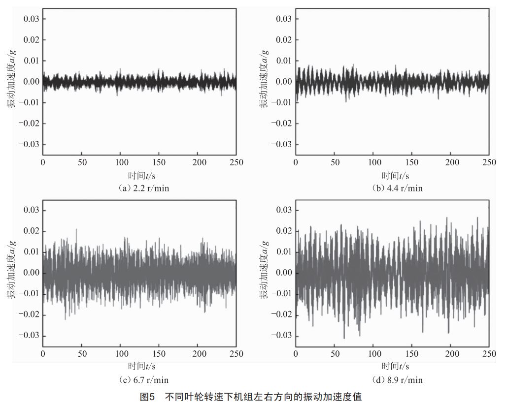 為了探究在故障工況下機組的運行特征,基于上述研究進行機組在不同轉速下的振動分析。分別對機組在2.2、4.4、6.7、8.9r/min轉速下水平方向的振動進行了測試,測試結果如圖5所示,圖(a)~(d)分別為葉輪轉速為2.2、4.4、6.7、8.9r/min時機組在水平方向的振動加速度值,為保證數(shù)據(jù)的穩(wěn)定性,統(tǒng)計時間設為250S。從圖中可以看出,塔架振動加速度波形表現(xiàn)為簡諧運動,同時隨著機組轉速的增大,塔架的振動加速度波形峰值也出現(xiàn)了明顯的增加。