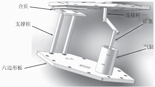 每個(gè)獨(dú)立關(guān)節(jié)均為旋轉(zhuǎn)關(guān)節(jié),當(dāng)氣缸內(nèi)部充氣時(shí),活塞伸長,使上層板繞合頁軸翻轉(zhuǎn)一定的角度,從而實(shí)現(xiàn)機(jī)械臂向特定方向彎曲。活塞行程越大,翻轉(zhuǎn)角度越大。由于各關(guān)節(jié)之間120°夾角放置,因此可實(shí)現(xiàn)多個(gè)方向彎曲運(yùn)動(dòng)。