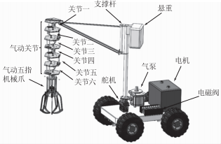 將其連接在一個(gè)移動(dòng)平臺上,平臺為一遙控電動(dòng)小車,本文不作具體介紹。柔性機(jī)械臂和移動(dòng)平臺之間通過舵機(jī)和固定梁連接,氣動(dòng)手爪固定于機(jī)械臂末端。