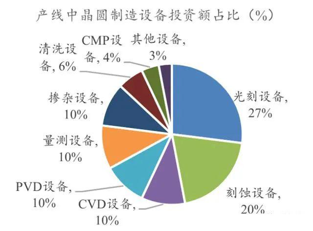 資料顯示,光刻工藝是芯片制造過程中占用時間比最大的步驟,約占芯片制造總時長的40%-50%。同時,光刻機也是目前晶圓制造產線中成本最高的半導體設備,約占晶圓生產線設備總成本的27%。目前最先進的 EUV 設備在2018 年單臺平均售價高達 1.04 億歐元。