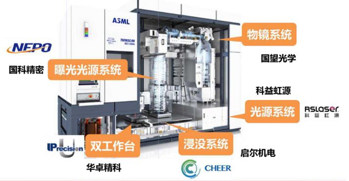 以NXT:2000i為例, 各子系統(tǒng)拆分如下:上海微電子負責光刻機設計和總體集成,北京科益虹源提供光源系統(tǒng),北京國望光學提供物鏡系統(tǒng),國科精密提供曝光光學系統(tǒng),華卓精科提供雙工作臺,浙江啟爾機電提供浸沒系統(tǒng)。