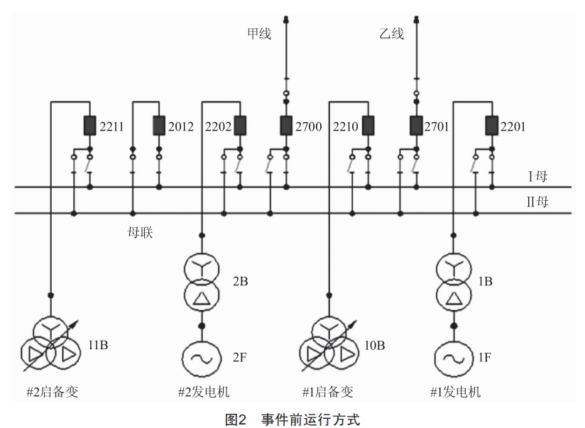 2024年2月9日,某電廠2號(hào)機(jī)大修后做汽機(jī)超速試驗(yàn)。2號(hào)機(jī)組帶245MW負(fù)荷,2號(hào)機(jī)做大修后汽機(jī)超速試驗(yàn)負(fù)荷降至3MW,2號(hào)機(jī)組、2號(hào)啟備變、甲線掛220kV1M母線,乙線、2號(hào)機(jī)組、2號(hào)啟備變掛220kV2M母線,雙母線并列運(yùn)行,如圖2所示。