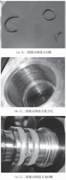 圖2為機1隨動閥油路入口損壞O圈,顯示已剪切失效,局部有飛邊現(xiàn)象,徑向有明顯螺紋槽壓痕,另外配合孔密封面粗糙有毛刺,實測接頭O型密封圈密封面粗糙度大于Ra3.2。