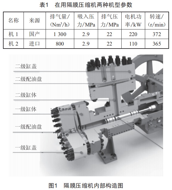 隔膜壓縮機是一種特殊的容積式壓縮機,曲軸箱內(nèi)組件與一般往復(fù)壓縮機類似,其余采用特殊結(jié)構(gòu)的活塞桿:液壓油系統(tǒng),運行時通過一組膜片將膜腔分隔為氣體壓縮腔和液壓油腔:膜片組件,膜片在液壓油推力的作用下完成膨脹、吸氣、壓縮、排氣的循環(huán)過程。本文主要分析影響氫燃料供氫中心加氫母站隔膜壓縮機長周期運行的因素及相關(guān)改進措施。
