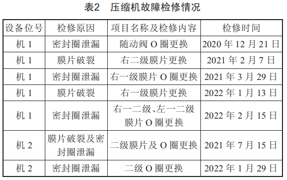 表2羅列了機1、機2自2020年12月15日投用以來設(shè)備檢修情況,從故障情況來看,O型密封圈密封失效及膜片破裂損壞是影響機組長周期穩(wěn)定運行的主要因素。