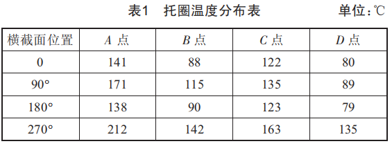 建模過程中使用的托圈材料參數(shù)均參照廠家規(guī)范標準,其中,鋼材料密度為7850kg·m-3,泊松比為0.3,彈性模量為2x105MPa,線膨脹系數(shù)為3.5×10-6/℃:內環(huán)r0=4.3m,外環(huán)r1=5.1m,h=2.5m。上面經過分析已經確定托圈熱傳導的時間條件與邊界條件,因此,通過測量托圈在0、90o、180o、270o四個橫截面處的溫度,按照線性插值的方式即可計算托圈各點的溫度值,溫度節(jié)點示意圖如圖2所示。