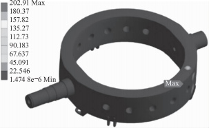 通過建立托圈模型并在托圈外部施加溫度場對轉爐工作中托圈部件進行熱應力分析,托圈整體熱應力云圖如圖3所示,托圈整體變形如圖4所示。