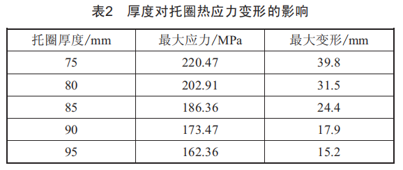 由表2可以看出,當托圈厚度增大時,轉爐在工作中,托圈受到的最大熱應力值降低,且隨著厚度的均勻增大,最大熱應力降低的幅度逐漸降低:托圈的最大變形減小,且隨著厚度的均勻增大,最大變形值降低的幅度逐漸降低。因此,在實際工程中,可以通過適當增加托圈的厚度來保證轉爐工作的安全性,并且從數(shù)據(jù)結果可以看出,一味增加厚度也不可取,應選擇合理的厚度實現(xiàn)最大的安全效應和經濟效應。