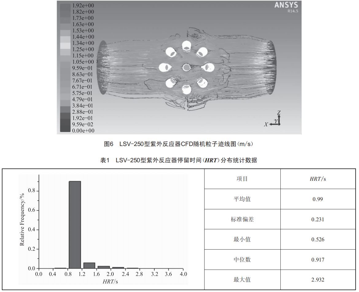 由表1所示的示蹤粒子停留時(shí)間分布數(shù)據(jù)可知,在反應(yīng)器中紫外燈、絲桿組件以及上下布置的擾流板作用下,粒子減少了死區(qū)導(dǎo)致的拖尾和短流的情況。