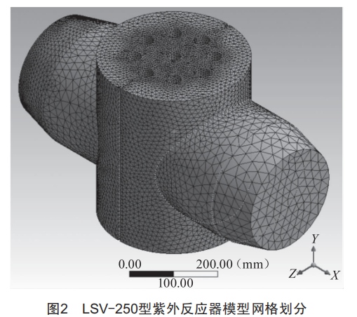 -LSV-250型紫外反應(yīng)器作為研究對象,該反應(yīng)器為封閉四通管式反應(yīng)器(圖1),內(nèi)有8只最大功率為3kw的中壓紫外燈,與流線呈垂直布置,燈管外裝配有石英套管用作隔離介質(zhì),實(shí)現(xiàn)熱隔離及維護(hù)便利性。