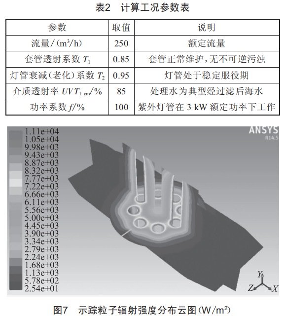 綜上所述,本文以LSV-250型紫外反應(yīng)器為例,通過使用離散坐標(biāo)(DO)輻射模型求解具有吸收、散射和壁面反射性質(zhì)介質(zhì)的輻射運(yùn)輸方程,輔助離散相模型(DPM)模擬浮游生物個(gè)體在紫外反應(yīng)器內(nèi)流區(qū)中的隨機(jī)運(yùn)動(dòng),從而計(jì)算獲得浮游生物在流區(qū)內(nèi)的軌跡和停判定紫外反應(yīng)器的滅活效率。
