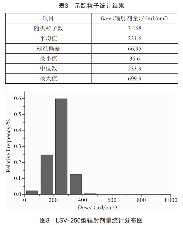 通過DPM模型可計(jì)算得到模擬粒子在時(shí)間和空間上的位置(即軌跡信息),配合DO模型得出每個(gè)質(zhì)點(diǎn)的輻射強(qiáng)度,可以通過求解單位時(shí)間步長內(nèi)該質(zhì)點(diǎn)接收到的紫外輻射強(qiáng)度對粒子在流區(qū)內(nèi)停留時(shí)間的積分得到其運(yùn)動(dòng)軌跡所受的紫外光輻射的累積量,即輻射劑量(DoSe)。本文通過編程導(dǎo)入上述導(dǎo)出數(shù)據(jù)進(jìn)行數(shù)值積分,再通過計(jì)算入流端面均布的大量隨機(jī)粒子的運(yùn)動(dòng)軌跡及其積分即可生成該反應(yīng)器輻射劑量統(tǒng)計(jì)分布。