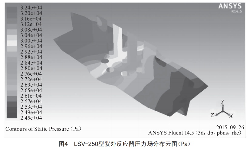 Fluent數(shù)值計(jì)算采用雙精度3d求解器,選擇標(biāo)準(zhǔn)y-epSilon(2eqn)湍流模型,動(dòng)量和湍流動(dòng)能采用二階迎風(fēng)差分,能量耦合、離散坐標(biāo)和湍流耗散率采用一階迎風(fēng)差分,分別可求解得紫外反應(yīng)器內(nèi)部的速度場(圖3)和壓力場(圖4)分布云圖。