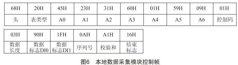 在該控制幀中,表類型為20H,即熱量表:A0~A6為所要采集的能耗儀表的地址(09590160312345),其中09590為儀表生產廠商代碼,1603為生產時間(2016年3月),12345為儀表子編號:控制碼01H(00000001B)的最高位0對應前述協(xié)議表示該幀為主站發(fā)出的控制幀,低五位00001表示該幀的功能為所讀取儀表數(shù)據:數(shù)據長度為03H即對應數(shù)據90H、1FH和0AH三個字節(jié):數(shù)據標志DI0、DI1為數(shù)據段開始標志,該標志后直至校驗和之前為所傳送的數(shù)據段:校驗和A1H為從該幀的起始字節(jié)開始全部字節(jié)相加后取最低兩個十六進制位:結束標志為16H,表示該幀傳送全部結束。