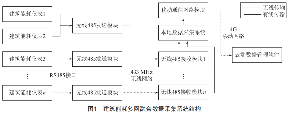 建筑能耗多網融合數(shù)據采集系統(tǒng)由能耗儀表、無線485通信模塊、本地數(shù)據采集系統(tǒng)、移動通信網絡模塊和云端數(shù)據管理軟件組成,其基本結構原理如圖1所示。