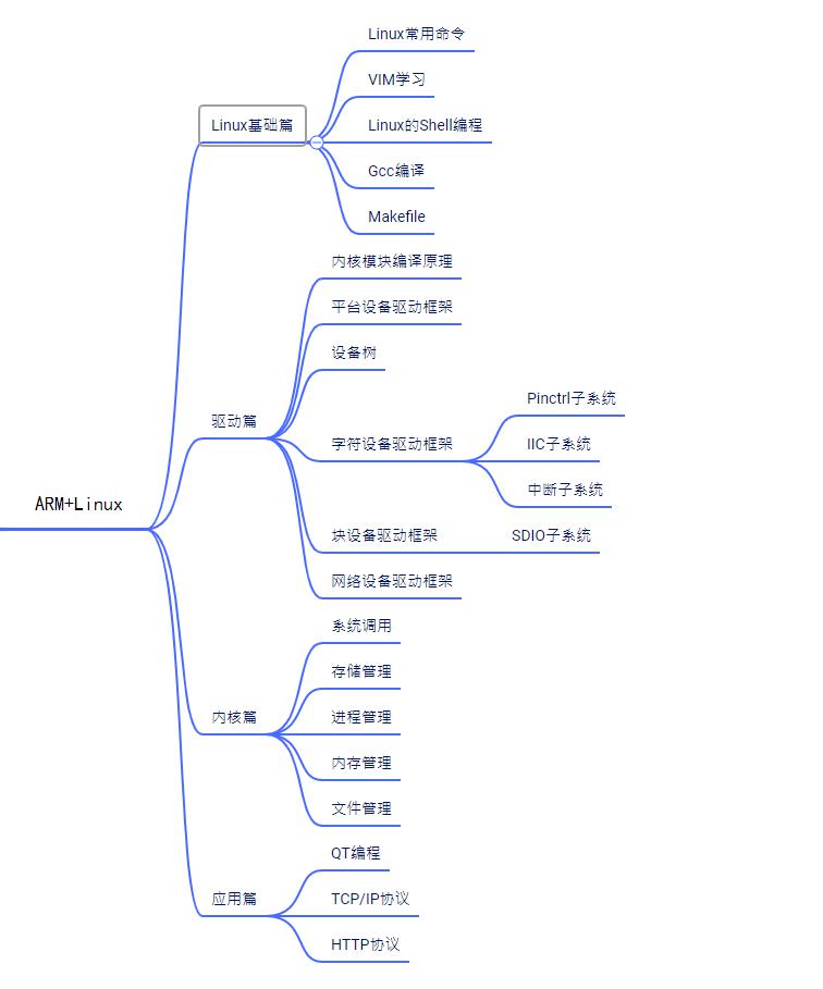 該部分主要學(xué)習(xí):內(nèi)核模塊編譯原理、字符設(shè)備驅(qū)動框架、平臺設(shè)備驅(qū)動、設(shè)備樹、Pinctrl子系統(tǒng)、I2C子系統(tǒng)、中斷子系統(tǒng)、塊設(shè)備驅(qū)動框架、Bootloader等