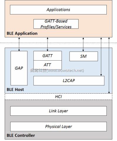 BLE的協(xié)議可分為Bluetooth Application和Bluetooth Core兩大部分,而B(niǎo)luetooth Core又包含BLE Controller和BLE Host兩部分。