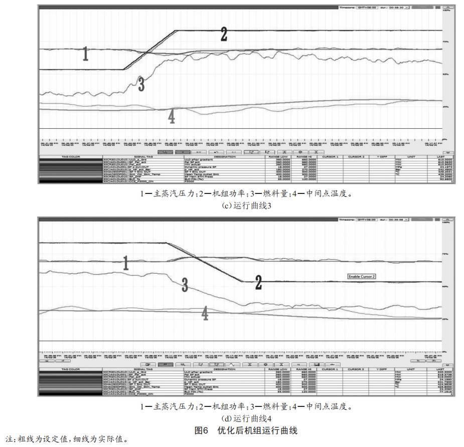 經(jīng)過燃料和給水解耦優(yōu)化控制后,主蒸汽壓力穩(wěn)定,偏差在0.2MPa以內(nèi),中間點溫度控制平穩(wěn),偏差在8℃以內(nèi),主蒸汽、再熱蒸汽溫度的穩(wěn)定性大大提高,主蒸汽溫度偏差在4℃以內(nèi),再熱蒸汽溫度偏差在6℃以內(nèi),大大提高了整個機組運行的穩(wěn)定性。