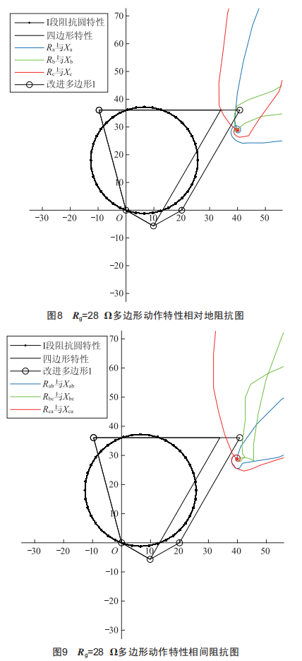 由圖6和圖7可知,當(dāng)用四邊形動(dòng)作特性來代替阻抗圓動(dòng)作特性且Rg=18Q時(shí),相對(duì)地阻抗與相間阻抗均在保護(hù)動(dòng)作的范圍內(nèi)。