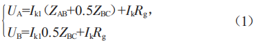 在圖1中,母線B、C這段線路的中點(diǎn)處發(fā)生短路故障,此時(shí)過渡電阻為Rg。其中電源E1提供的短路電流為Ik1,電源E2提供的短路電流為Ik2。短路電流Ik=Ik1+Ik2。