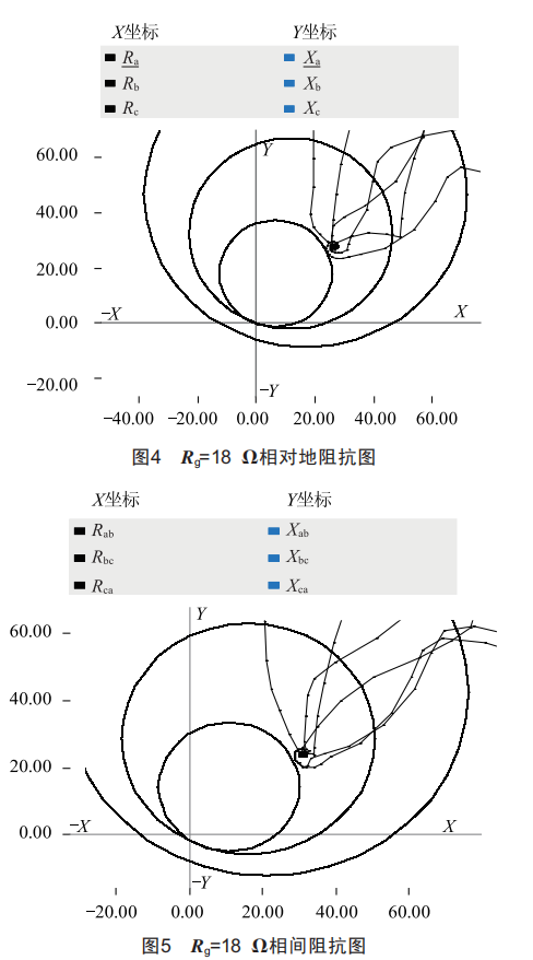 (2)在PSCAD中將故障過渡電阻Rg設(shè)定為18Q,同樣在線路L2的中點(diǎn)處模擬a、b、c三相故障情況,得到的線對(duì)地阻抗與三段距離保護(hù)各段保護(hù)阻抗圓之間的關(guān)系如圖4所示,相間阻抗與三段距離保護(hù)各段保護(hù)阻抗圓之間的關(guān)系如圖5所示。