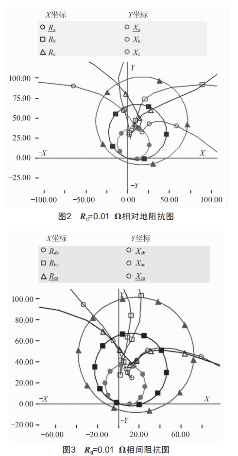 (1)在PSCAD中將故障過渡電阻Rg設(shè)定為0.01Q,在線路L2的中點(diǎn)處模擬a、b、c三相故障情況,得到的線對(duì)地阻抗與三段距離保護(hù)各段保護(hù)阻抗圓之間的關(guān)系如圖2所示,相間阻抗與三段距離保護(hù)各段保護(hù)阻抗圓之間的關(guān)系如圖3所示。