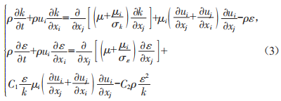 本文使用標(biāo)準(zhǔn)K-ε方程描述湍流流動(dòng),如式(3)所示:
