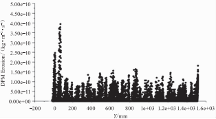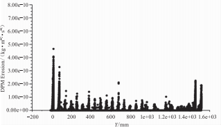 比對(duì)錯(cuò)列及順列換熱器內(nèi)顆粒的運(yùn)動(dòng)軌跡可以發(fā)現(xiàn):在粒徑較小的情況下,顆粒撞擊第一排管束的情況差異較小,區(qū)別較大的在于管束的第二排。如圖10所示,即使錯(cuò)列布置的換熱器內(nèi)顆粒粒徑較小(即顆粒直徑dp=20μm),顆粒撞擊第二排管束的概率依然很大。顆粒首先受到第一排管束的遮擋,部分與其發(fā)生直接撞擊,就算不與第一排管束發(fā)生碰撞的顆粒也幾乎全部會(huì)與第二排管束發(fā)生碰撞。當(dāng)顆粒粒徑增大時(shí),情況就會(huì)更加明顯,如圖8所示。但對(duì)于順列換熱器來(lái)說(shuō),如圖9所示,當(dāng)顆粒粒徑較小時(shí),顆粒幾乎不會(huì)與第二排管束發(fā)生碰撞,只有當(dāng)顆粒粒徑較大時(shí)才有一些顆粒會(huì)撞擊到第二排管子,如圖7所示。從整體上看,對(duì)比圖7~圖10,在相同的顆粒粒徑下,錯(cuò)列換熱器中顆粒撞擊管束的概率明顯高于順列。當(dāng)顆粒直徑為50um時(shí),在錯(cuò)列換熱器中,幾乎全部的顆粒都會(huì)與管壁相碰撞:而在順列換熱器中,部分顆粒會(huì)保持與煙氣一起在管束間從上至下較"順利"地流經(jīng)換熱器。