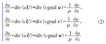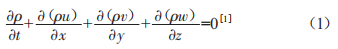 式中:β為流體的密度(kg/m3):t為時(shí)間:u、y、w分別為λ、y、:三個(gè)方向上的速度分量。