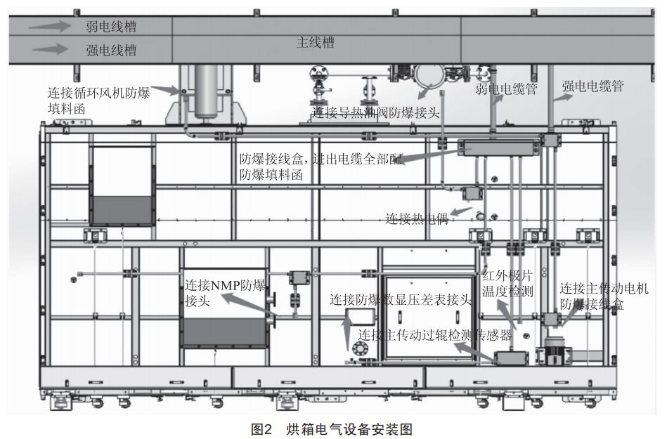 參照國標(biāo)《爆炸性氣體環(huán)境用電氣設(shè)備第15部分:危險場所電氣安裝(煤礦除外)》(GB3836.15—2000)要求進(jìn)行烘箱區(qū)域布線及設(shè)備安裝,如圖2所示,整體說明如下:烘箱區(qū)域內(nèi)電纜都是通過線槽、電纜管、波紋管(極少數(shù)設(shè)備于電纜管交接處使用)進(jìn)行敷設(shè)。線槽、金屬電纜管、波紋管只是對電纜起保護作用,防爆隔離是經(jīng)過進(jìn)入設(shè)備的防爆密封接頭來完成的,強電電纜都是整根進(jìn)入設(shè)備內(nèi)部,烘箱區(qū)域沒有電纜接頭。部分信號電纜會進(jìn)入防爆接線盒內(nèi),通過接線端子進(jìn)行信號分配,防爆接線盒電纜進(jìn)線、出線都是根據(jù)電纜線徑選擇合適的防爆密封接頭進(jìn)行密封。