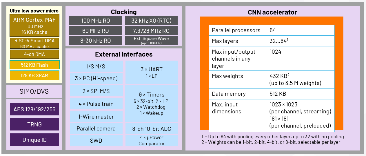 此外,MAX78000還集成了兩個(gè)MCU核心用于系統(tǒng)控制,即ArmCortex-M4處理器和32位RISC-V處理器,其中Arm Cortex-M4F處理器以100MHz運(yùn)行,客戶可以編寫(xiě)任何系統(tǒng)管理代碼,RISC-V處理器的獨(dú)特功能是支持以低功耗將數(shù)據(jù)快速加載到神經(jīng)網(wǎng)絡(luò)加速器,用戶可使用任何一種微控制器內(nèi)核將數(shù)據(jù)輸入到卷積神經(jīng)網(wǎng)絡(luò)的引擎中。而MAX78000具有432KB的權(quán)重存儲(chǔ)空間,與運(yùn)行在低功耗微控制器上的軟件解決方案相比,在配置并加載了數(shù)據(jù)后,MAX78000運(yùn)行AI推理的速度快了100倍,功耗還不到其1%。