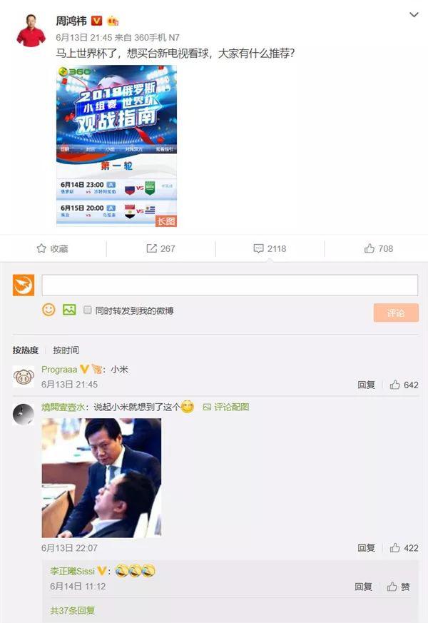 世界杯開幕前夕,周鴻祎就在微博上詢問:“馬上世界杯了,想買臺新電視看球,大家有什么推薦? ”評論下方網(wǎng)友清一色推薦小米電視,十分熱鬧。