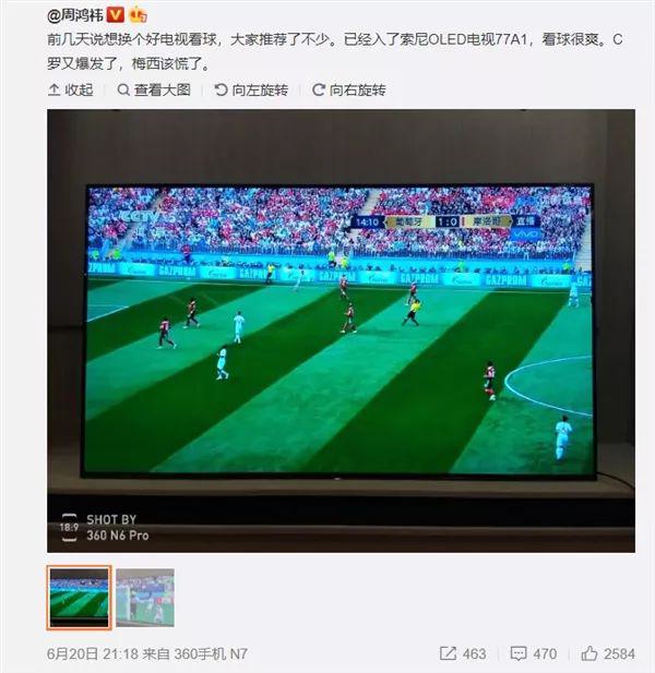 昨晚,周鴻祎曬出了自己的新電視:“前幾天說想換個好電視看球,大家推薦了不少。已經(jīng)入了索尼OLED電視77A1,看球很爽。C羅又爆發(fā)了,梅西該慌了。 ”
