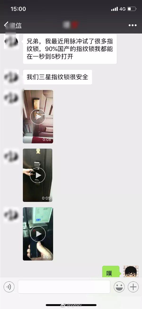 同樣在該網(wǎng)友的微信聊天記錄中,我們看到,其朋友表示“90%國產(chǎn)的智能鎖都能在1-5秒打開?!?