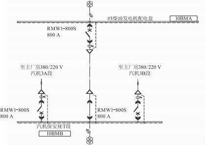 (3)設備增加情況:需增加兩面配電柜,含一個聯(lián)絡斷路器柜、柴油機電源、一個PT柜。機組汽機、鍋爐PC-A/B段無須增加配電柜。增加聯(lián)絡開關及柴油發(fā)電機備用電源并聯(lián)的動力電纜(RZ-yJV22-13*185+95)。I段、Ⅱ段工作/備用電源聯(lián)絡間可自動聯(lián)動(通過DCS組態(tài)或電源切換裝置實現(xiàn)),也可不自動聯(lián)動,通過人工斷合。