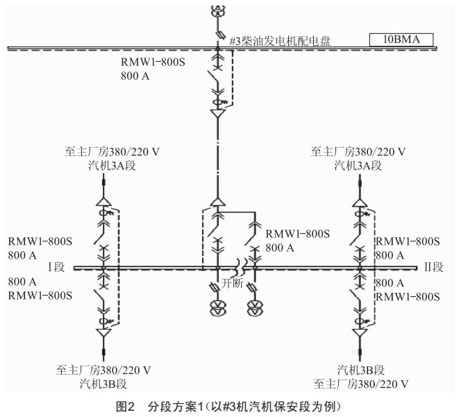 方案3與方案2相同之處不再贅述,僅在柴油發(fā)電機進線方式上有所不同,分段后的兩段保安段根據(jù)實際分段情況保持原柴油發(fā)電機備用電源進線開關和位置不變,即柴油發(fā)電機備用電源進線只上兩段保安段的其中一段。采用此方案分段,可最大限度降低投資、減少施工,也是分段變動最小的方案。