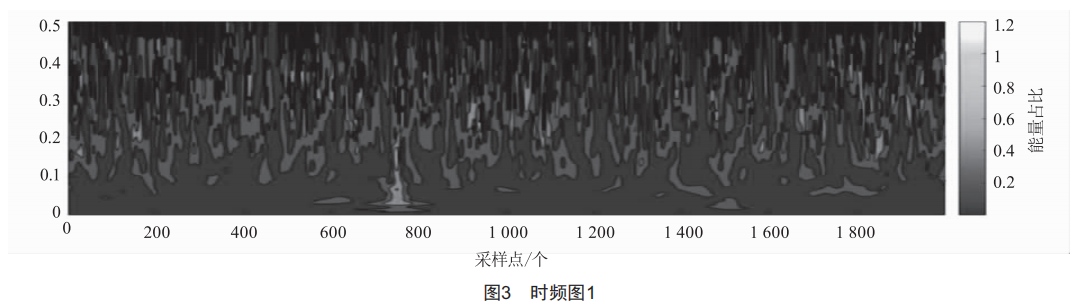 根據(jù)前文所述,先對被噪聲污染的仿真信號y進(jìn)行S變換,得到y(tǒng)的時頻域圖,如圖3所示,可以發(fā)現(xiàn),該圖無法直觀找到主要能量集中段。