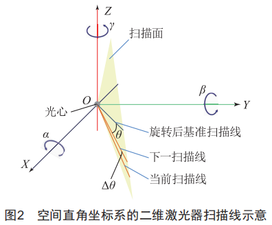 忽略二維激光器發(fā)射器和接收器的相對位置,即定義接收位置為光心,實際掃描線會繞X軸、y軸、Z軸旋轉(zhuǎn)角度。定義3個軸的旋轉(zhuǎn)角度分別為α、8、y,掃描角為9,角精度A9。以沿X軸掃描為例,光心位置為原點,在空間直角坐標(biāo)系中相鄰掃描線如圖2所示。