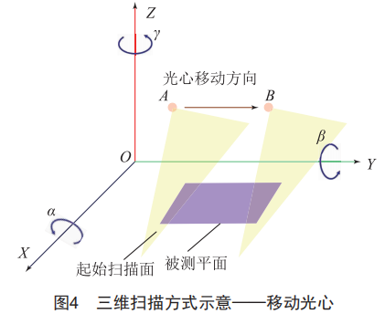 如圖4所示,激光器沿與X軸平行的方向掃描,將光心沿與y軸平行的方向移動,即從A點移動到B點,此時也可以實現(xiàn)下方物體的三維掃描。