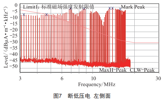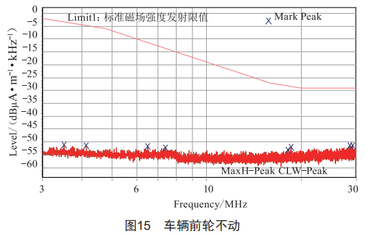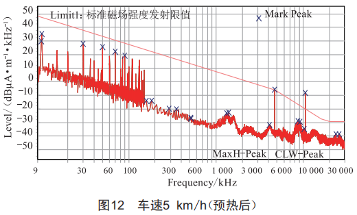 第一步:斷車輛低壓電,輪轂帶動車輛,速度40km/h,測試頻段3~30MHz,測試結(jié)果如圖7所示。