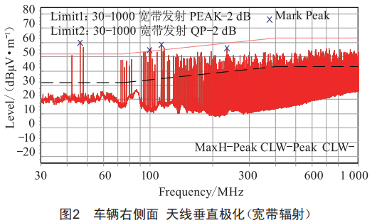 按照標(biāo)準(zhǔn)要求進行寬帶輻射發(fā)射試驗,車輛狀態(tài)40km/h。測試未通過,圖2為測試結(jié)果。