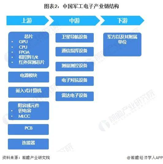2、產(chǎn)業(yè)鏈剖析:上游產(chǎn)業(yè)鏈細(xì)分領(lǐng)域較多軍工電子行業(yè)的上游元器件細(xì)分領(lǐng)域較多,包括芯片(CPU、GPU、FPGA、相控陣TR、紅外探測芯片)、電源模塊、嵌入式計算器、阻容感元件等;軍工電子行業(yè)的中游包括各種軍工產(chǎn)品,包括衛(wèi)星導(dǎo)航設(shè)備、通信指揮設(shè)備、測量測控設(shè)備、電子對抗設(shè)備等;下游為使用方。