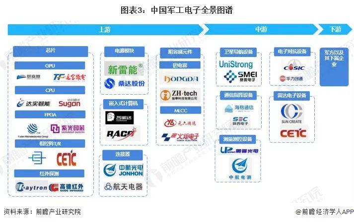 中國軍工電子上游代表性芯片企業(yè)有景嘉微、達實智能、中科曙光、紫光國微等;電源模塊代表性企業(yè)有新雷能;嵌入式計算機代表性企業(yè)有智明達;連接器代表性企業(yè)包括中航光電等;阻容感元件代表性企業(yè)包括火炬電子和鴻遠(yuǎn)電子;中游代表性企業(yè)包括中航電測、賽微電子、華力創(chuàng)通等。