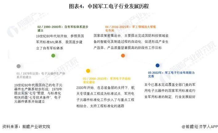 19世紀(jì)50年代,我國軍工電子行業(yè)標(biāo)準(zhǔn)初步提出,主要以轉(zhuǎn)化和引用蘇聯(lián)標(biāo)準(zhǔn)為主。在19世紀(jì)60年代初步形成了我國自己的電子元器件生產(chǎn)體系。1978年,提出實施“七?!惫芾?,與標(biāo)準(zhǔn)化相關(guān)的是“七專技術(shù)條件”,我國電子元器件體系開始建立。19世紀(jì)80年代起,參照美國標(biāo)準(zhǔn)MIL體系,我國開始逐步建立了自有的軍標(biāo)體系。20世紀(jì)起,在總裝備部的支持下,航天轉(zhuǎn)向重點工程成為標(biāo)準(zhǔn)試點,我國軍用電子元器件標(biāo)準(zhǔn)化工作步入了與重點工程相結(jié)合、支持工程標(biāo)準(zhǔn)化的道路。2016年,我國支持軍工電子發(fā)展的政策開始密集出臺,主要提出完成國防科技領(lǐng)域裝備的智能化及制造過程的自動化。發(fā)展至今,軍工電子行業(yè)布局已經(jīng)較為完善。