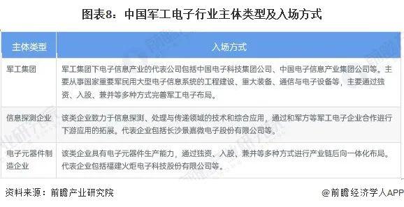 2、軍工電子行業(yè)內(nèi)企業(yè)主體類型和入場方式我國軍工電子行業(yè)市場主體類型主要有軍工集團、信息探測企業(yè)以及電子元器件企業(yè)等,主要通過獨資、入股、兼并等方式入場。