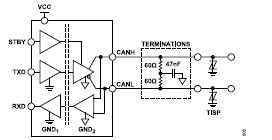 本文提及的組件測(cè)試使用ADM3055E/ADM3057E進(jìn)行,其他器件(ADM3050E、ADM3056E和ADM3058E)將共用一個(gè)收發(fā)器芯片。