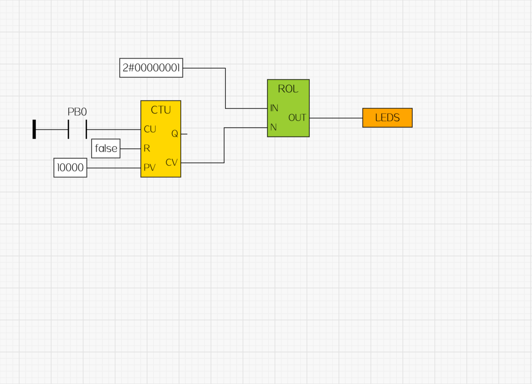 基本工作原理:將常量 1 進行循環(huán)向左移位,按鈕每按下一次,向左移動 1 位,將結果寫入 LEDS 變量。LEDS 是一個 8 位的無符號整數(shù)(即一個字節(jié)),分別對應前 8 個數(shù)字輸出。* 注意常量 1 的數(shù)據(jù)類型一定要指定為 USINT(即 8 位無符號數(shù)),才能保證按 8 位進行循環(huán)。