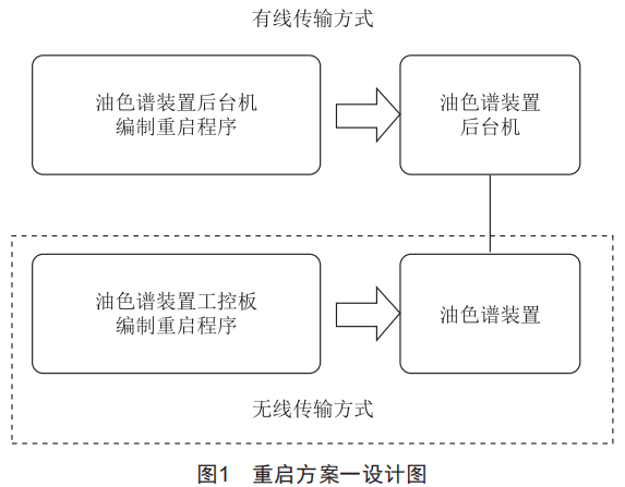 要求廠家在油色譜在線監(jiān)測裝置本體工控板寫入重啟程序,對于有線傳輸?shù)挠蜕V在線監(jiān)測裝置還需在后臺機(jī)系統(tǒng)中寫入重啟程序,讓裝置實現(xiàn)按預(yù)設(shè)定周期定時"軟"重啟(即不斷電重啟)。其方案設(shè)計圖如圖1所示。